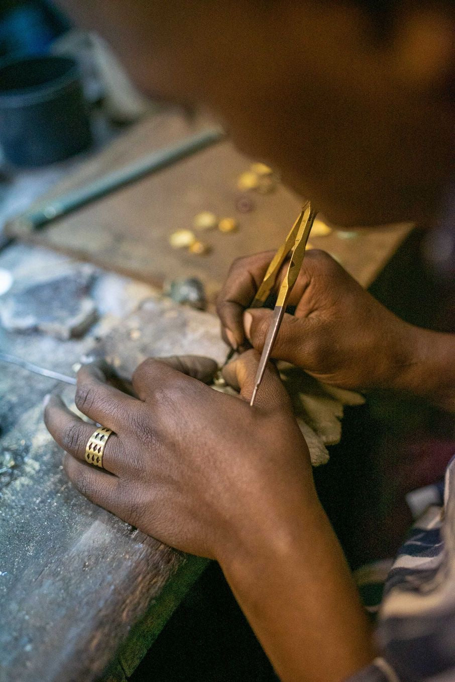 Chaque bijou IFTIIN naît de la main des artisans au Sénégal, où le bronze — alliage de cuivre et d’étain, capable de vieillir avec grâce — se façonne et se transforme. Chaque geste est pensé et répété avec patience, précision et respect des traditions, permettant au bronze de capturer les détails et les aspérités qui racontent le temps, le geste de l’artisan et l’histoire portée par chaque pièce unique.